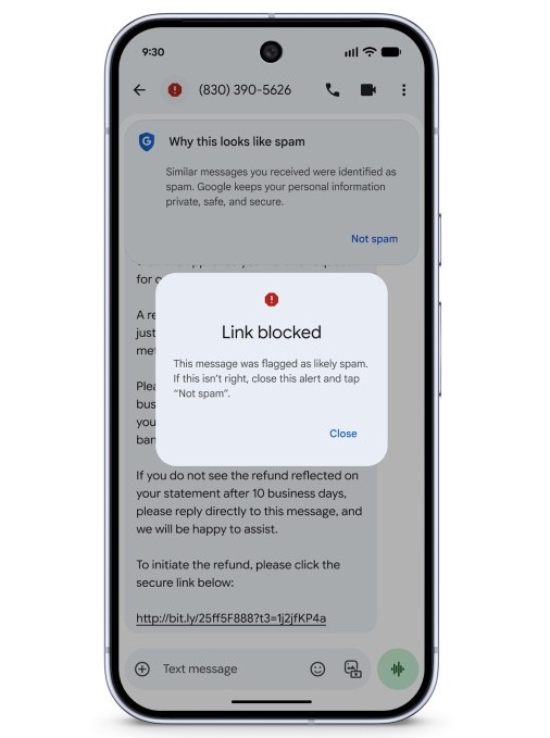 Для владельцев смартфонов Pixel компания запустила встроенную защиту от мошеннических и спам-сообщений. Теперь функция обнаружения спам-ссылок в Google Сообщениях станет доступна всем пользователям. При нажатии на подозрительное сообщение приложение выдаст предупреждение и запретит посещение этой страницы.